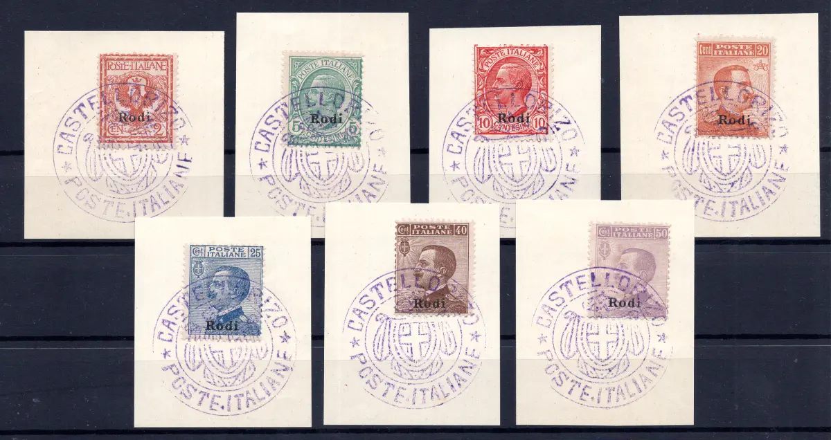 FRAGMENT - Castelrosso - Briefmarken Italiens überdruckt Rhodos, sieben verschiedene Werte (Nr. 1/3, 5/7 + 12) gestempelt auf kleinen Fragmenten mit violettem Stempel von Castellorizo mit Wappen in der Mitte - Ungewöhnlich Cod.1026/182