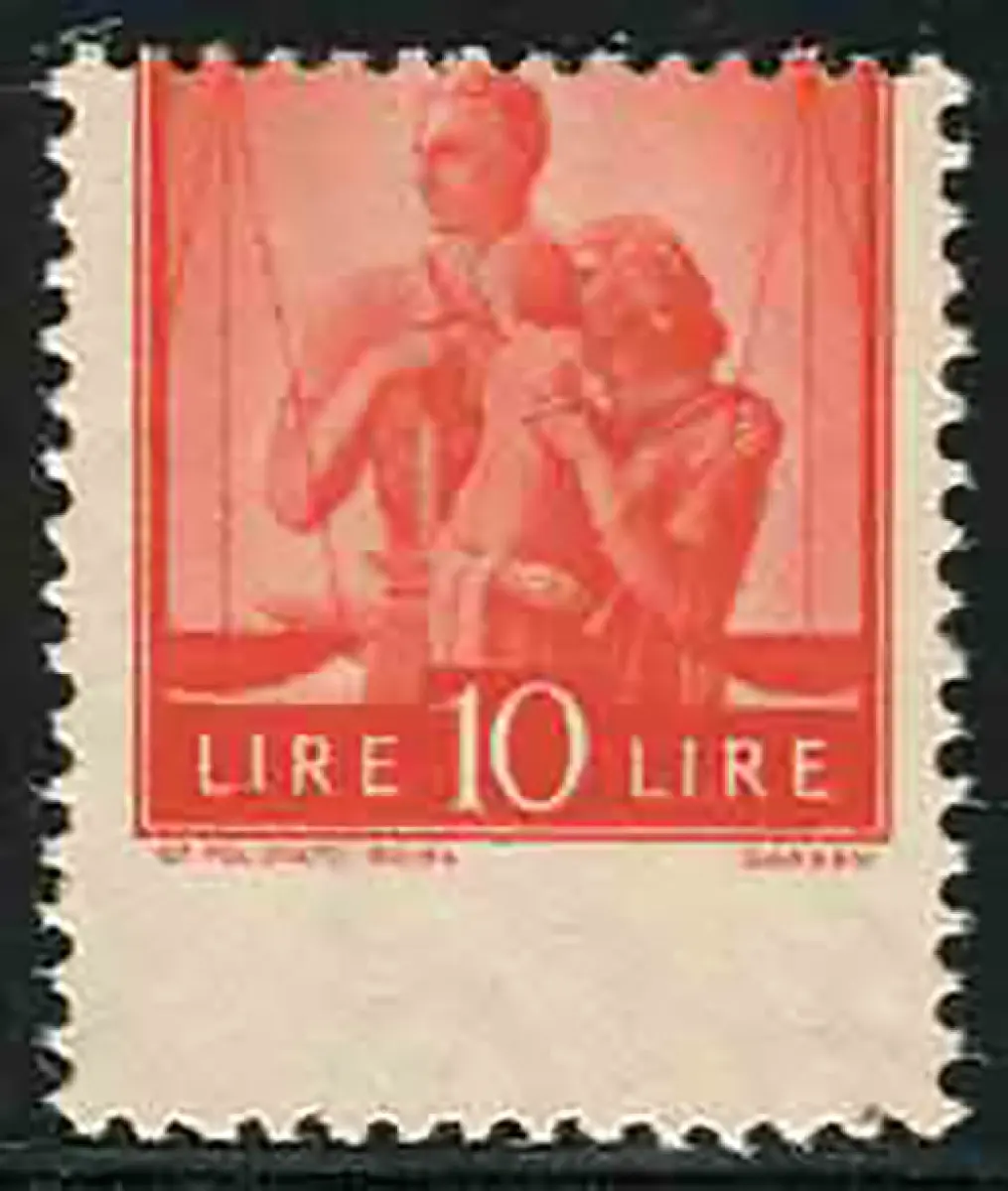 Democratica Lire 10 Sorten verschobene Verzahnung Vollgummi - Democratica Lire 10 Nr. 559u stark vertikal verschobene Verzahnung - Exemplar aus der letzten horizontalen Zeile des Blattes ohne Schriftzug Poste Italiane - Interessante Nr. 528/6