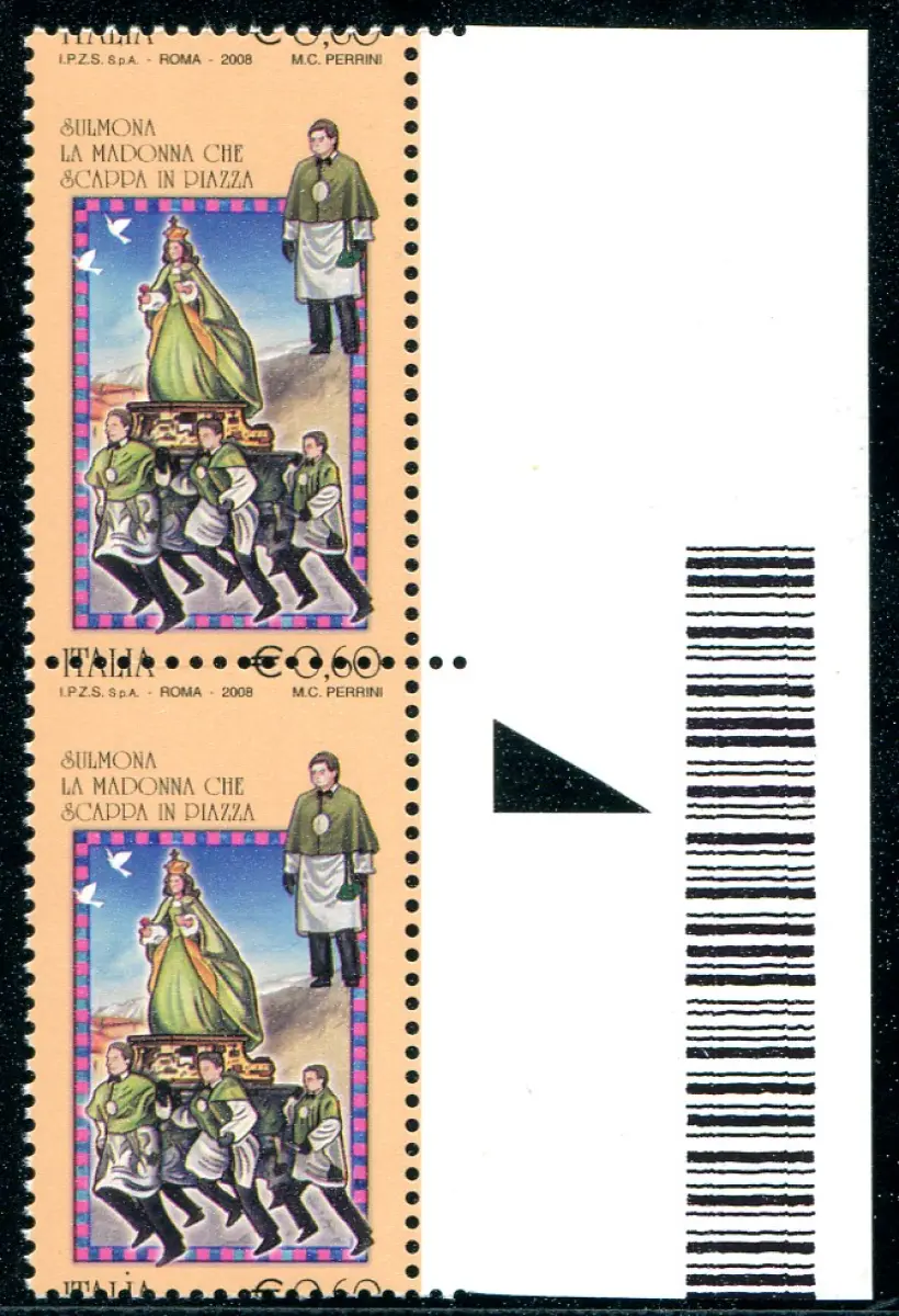 Folklore 2008 Sulmona Sortenpaar Vollgummi - Folklore 2008 Sulmona Nr. 3023 vertikales Paar mit stark verschobener horizontaler Verzahnung Scitta Italia Euro 0,60 zu Pferd der beiden Exemplare (Sass. spec. Nr. 2672 Ea) Cod. 881/13