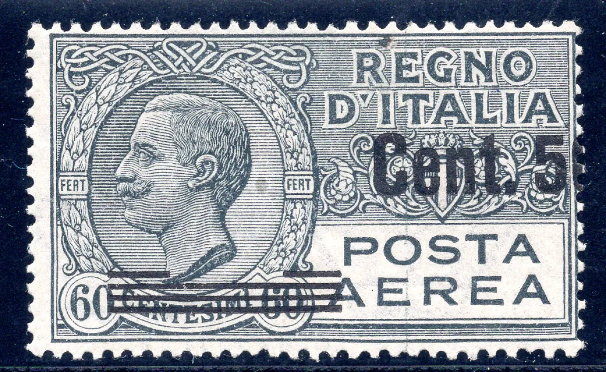 Luftpost Cent. 50 Solo Cent und Riegel - Sorte Linguellato - Luftpost Cent. 50 auf 60 Nr. 8e Aufdruck nur Cent. 5 und Balken - Selten, stammt aus der ersten senkrechten Blattreihe der stark nach rechts verschobenen Überdrucksorte - Selten - Katalog Euro 1.300 - Gebraucht Cod. 271/11
