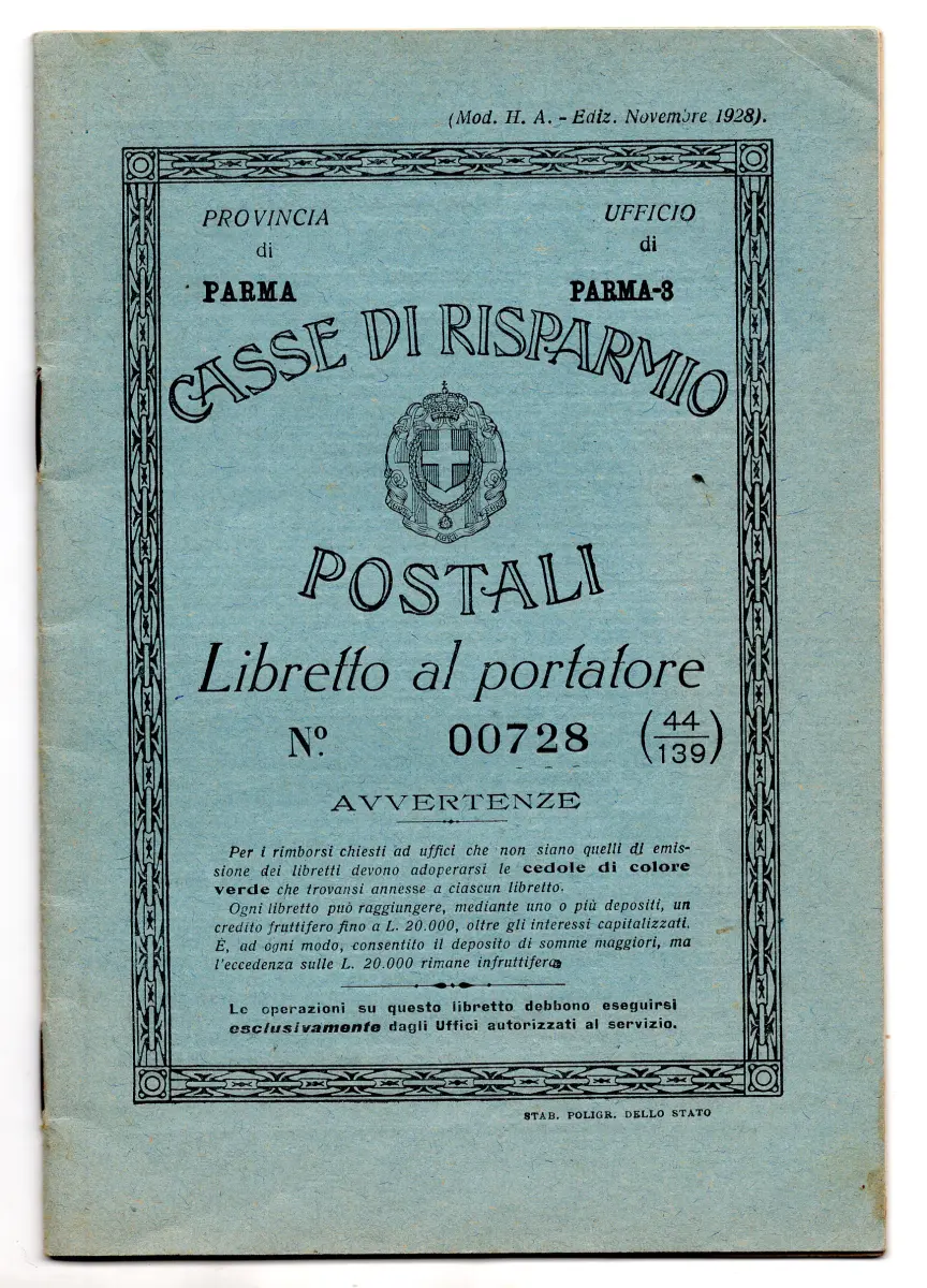 Postsparkassen - Trägerheft - Postsparkassen - Trägerheft (Mod. H. A. Ediz. November 1928) ausgestellt in Parma am 29.7.42 einwandfrei erhalten - Interessant für Sammlungen Postmodul Nr. 160/20
