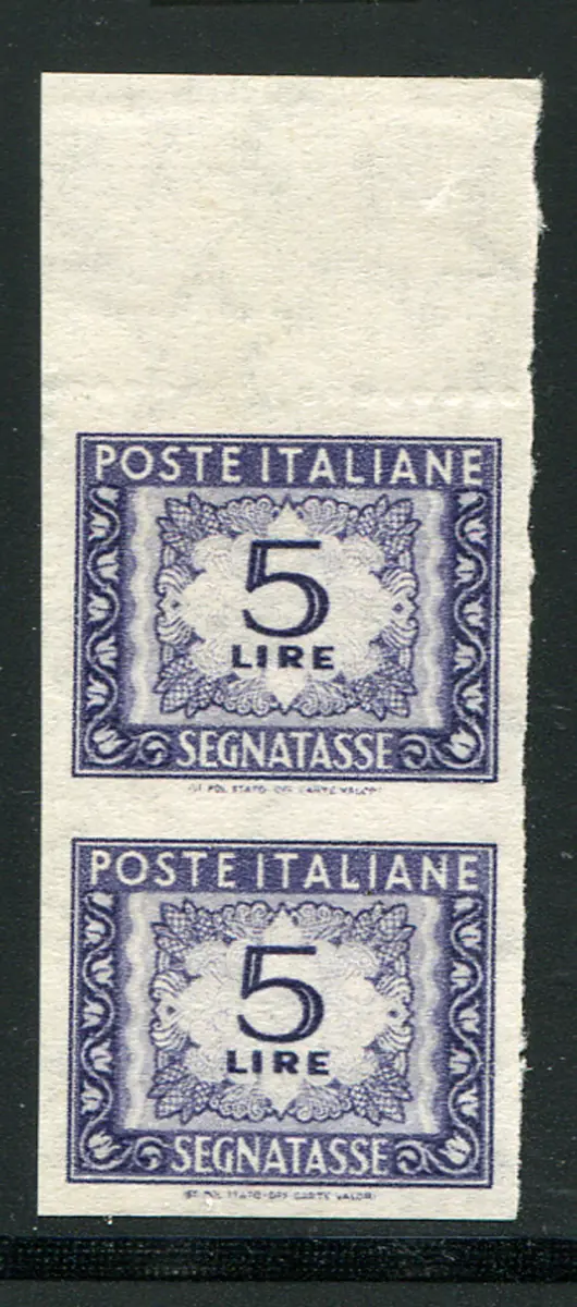 Steuermarken Lire 5 Sorten ungezähnt Vollgummi - Steuermarken Lire 5 Nr. 111/Iib ungezähntes vertikales Paar b. von f. - Das obere Exemplar zeigt beidseitige Blindverzahnung - Ungewöhnlich Cod. 907/13
