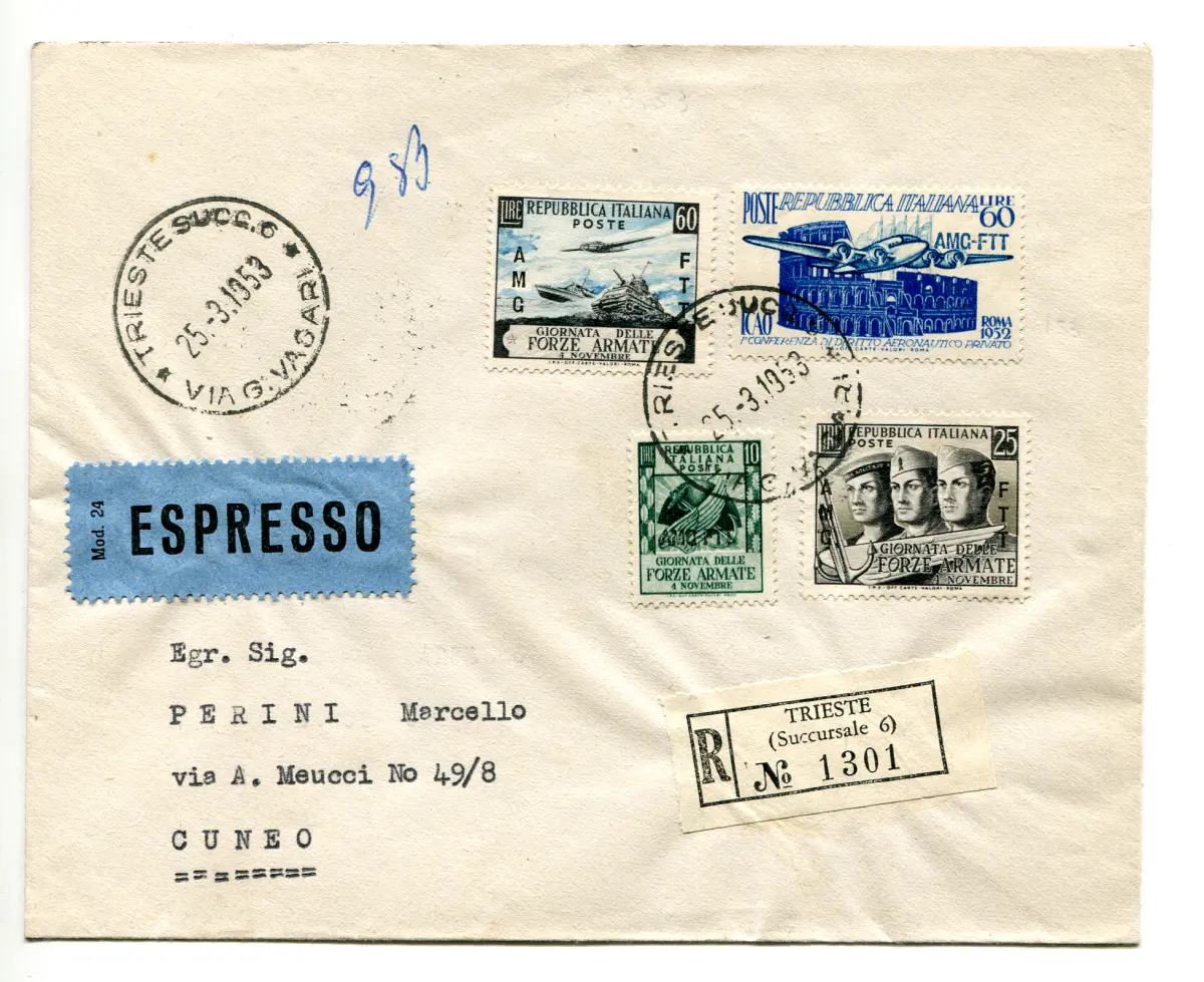 Umschlag - Triest A - ICAO Nr. 155 + Ergänzungsnr. 157/159 auf Umschlag Racc. Express nach Cuneo am 25.3.53 - Interessant, im Doppelportarif Cod.1496/WEB