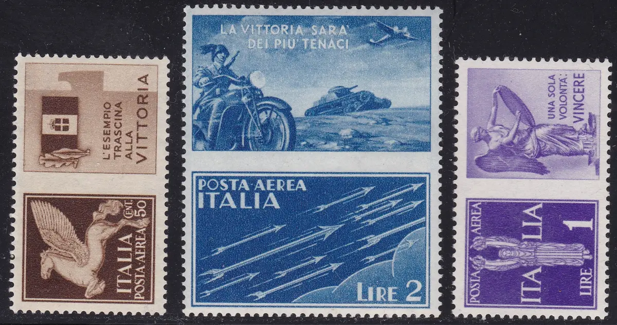 1942 KÖNIGREICH ITALIEN - Nr. 12A/12C Kriegspropaganda nicht ausgegeben MNH / ** Luftpostmarken mit Vignetten der Kriegspropaganda 3 Val, gute Zentrierung für diese Ausgabe.