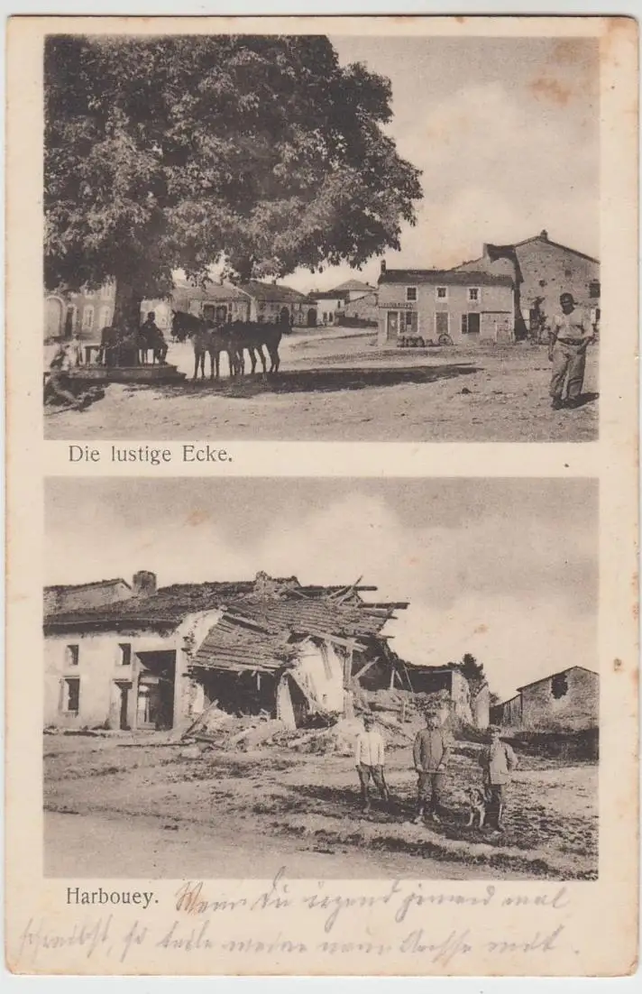 - (85539) Ansichtskarte, postcard, PPC - Harbouey, Frankr., 1. WK, zerstörte Gebäude, Feldpost 1916