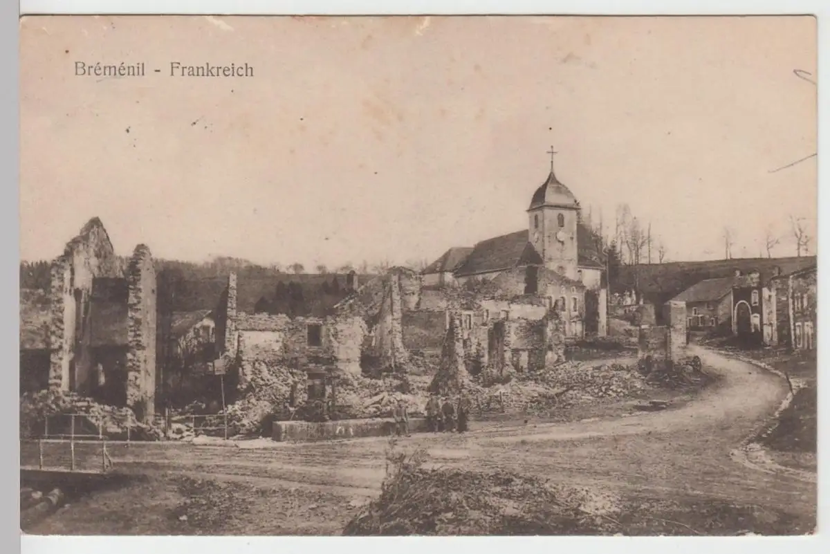 - (85932) Ansichtskarte, postcard, PPC - Bréménil, 1. WK, zerstörter Ort, Kirche, Feldpost 1915