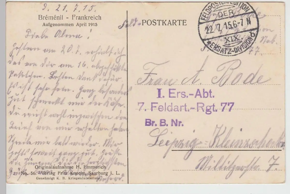 - Feldpost: 19. Ers. Div., 1. Ers. Abt., 7. Feldart. Reg. 77