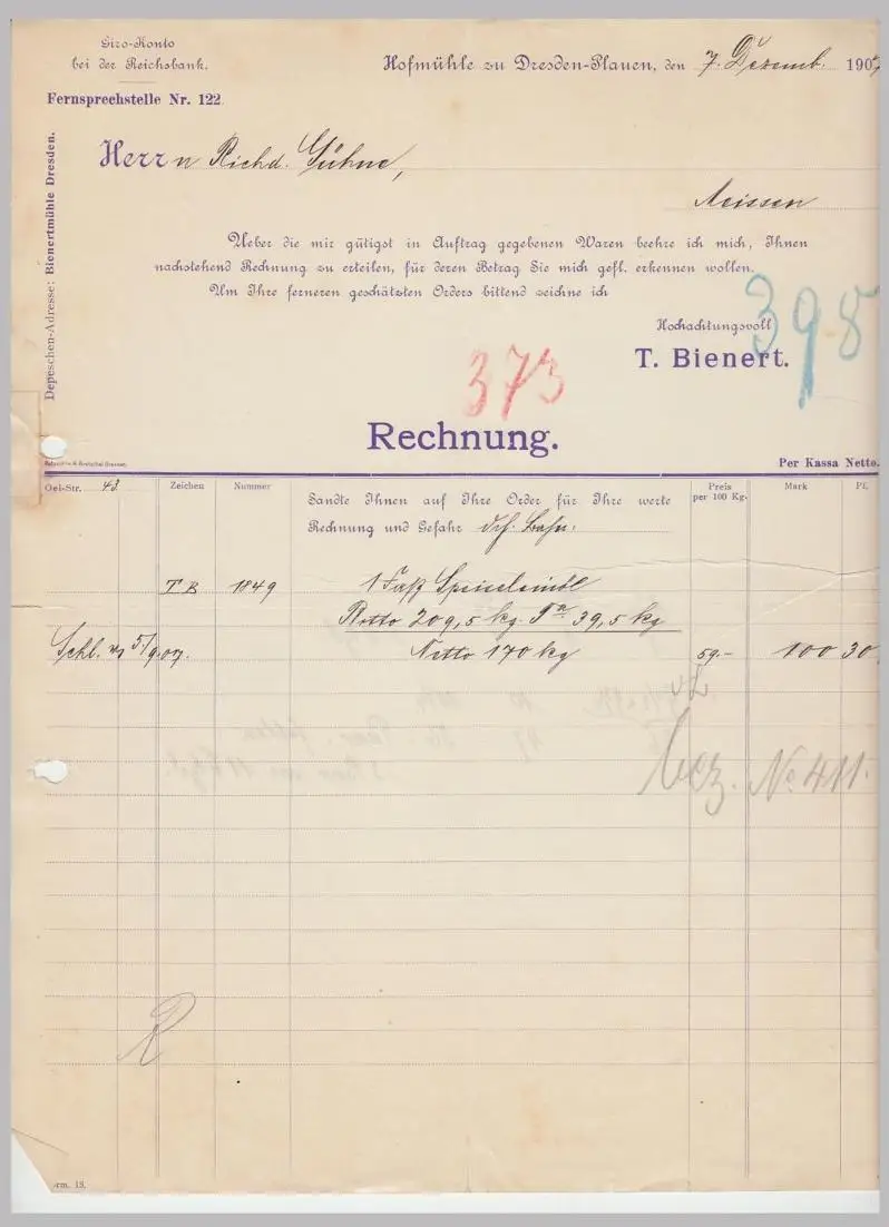 - (D130) 2 Stück Rechnung Fa. T.Bienert, Hofmühle zu Dresden-Plauen, 1907