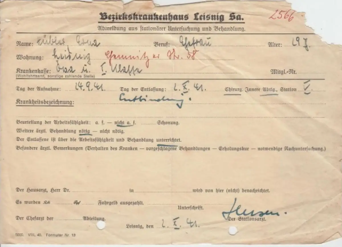 - (D17) Abmeldungsschein Bez-Krankenhaus Leisnig 1941