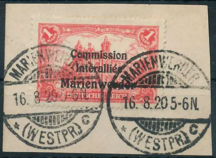1 Mark Wert aus der Aufdruckausgabe Marienwerder auf den Freimarken des deutschen Reiches (Germania 1916/1918) - Aufdruck 3-zeilig Commision........, geänderte Schrift