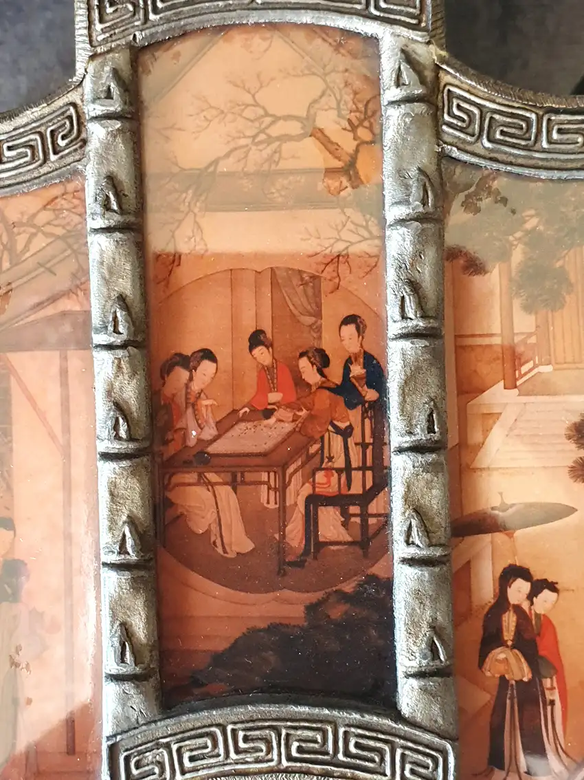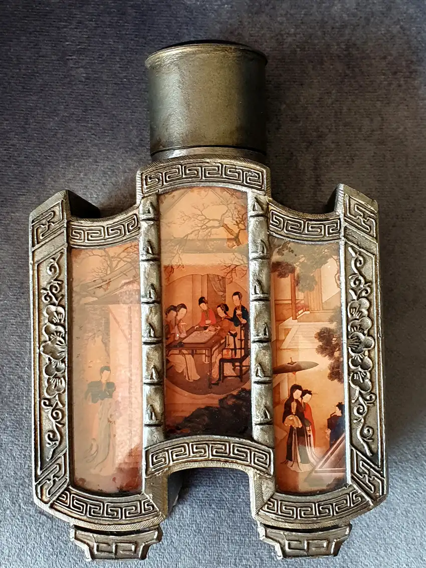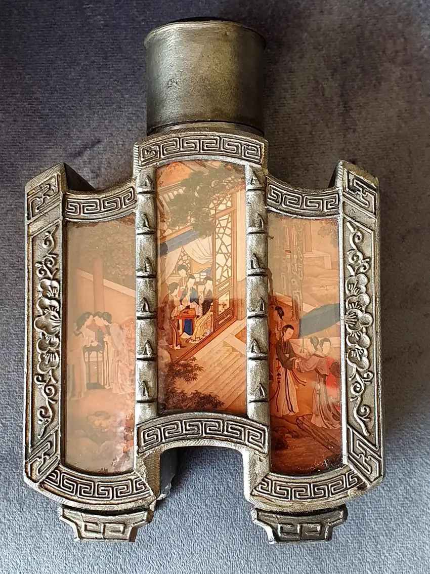 Chinesischer Tea Caddy - Teedose aus Zinn und hinter Glas bemalt - mit Stempel