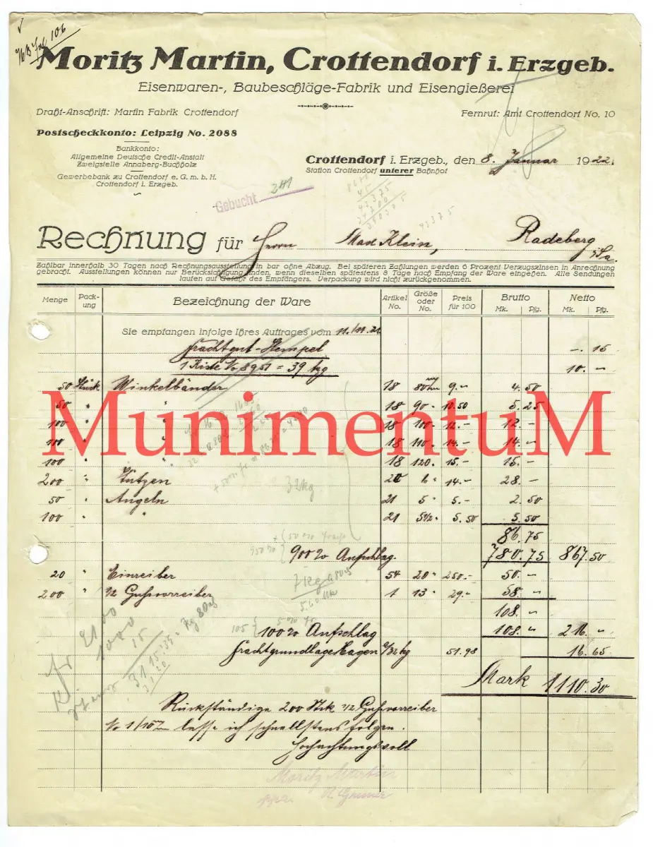 Baubeschläge-Fabrik M. Martin CROTTENDORF i. Erzgebirge - Rechnung 1922