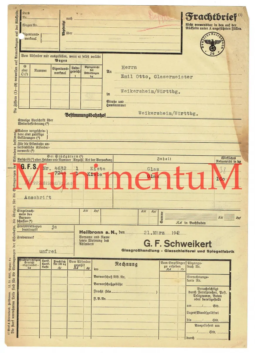 Frachtbrief HEILBRONN Spiegelfabrik Glasgroßhandlung Schweikert 1942