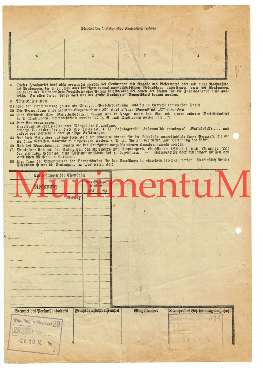 Frachtbrief WENDLINGEN ROTTENBURG 1946 bzgl. Leiterwagen U.S.-Zone Rollgeld