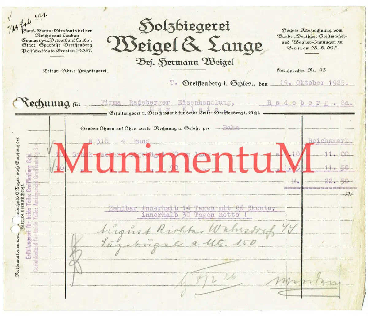 Holzbiegerei Weigel & Lange GREIFFENBERG , LÖWENBERG, i. SCHLESIEN Rechnung 1925