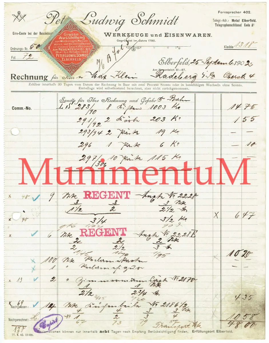 Peter Ludwig Schmidt ELBERFELD Werkzeuge + Eisenwaren WUPPERTAL - Rechnung 1902