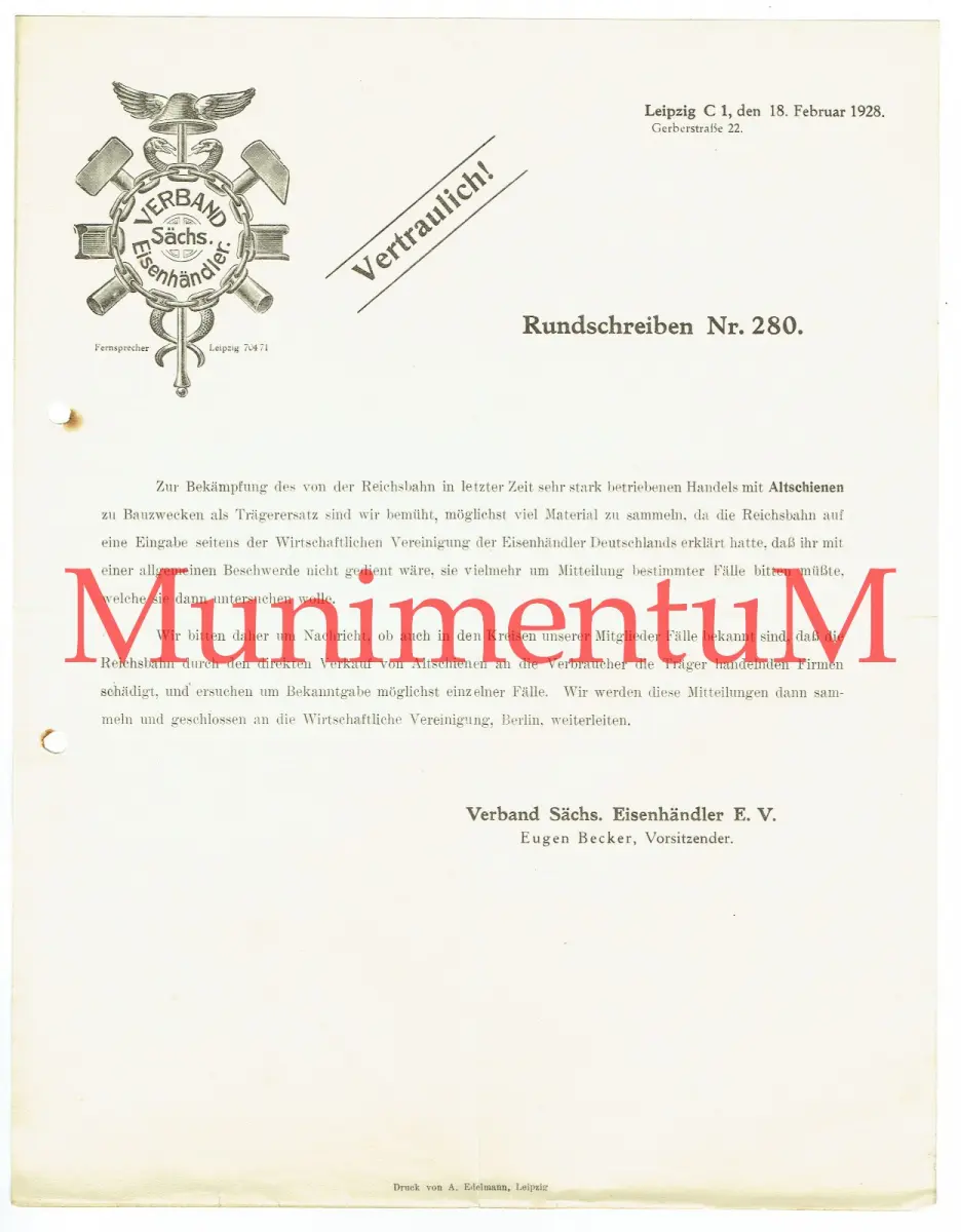 VERTRAULICH - Verband sächsischer Eisenhändler - Rundschreiben Nr. 280 Jahr 1928