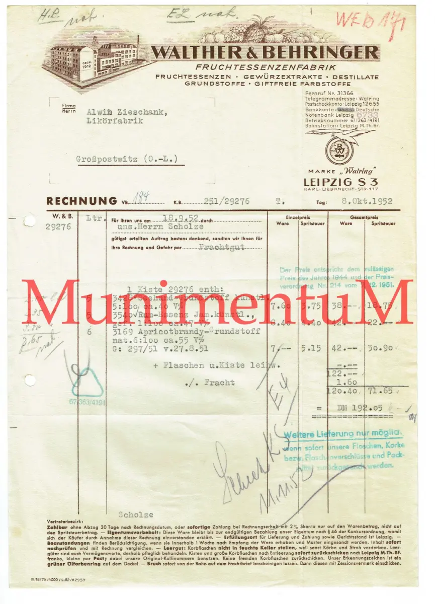 Walther & Behringer Fruchtessenzenfabrik Destillate LEIPZIG | Rechnung 1952