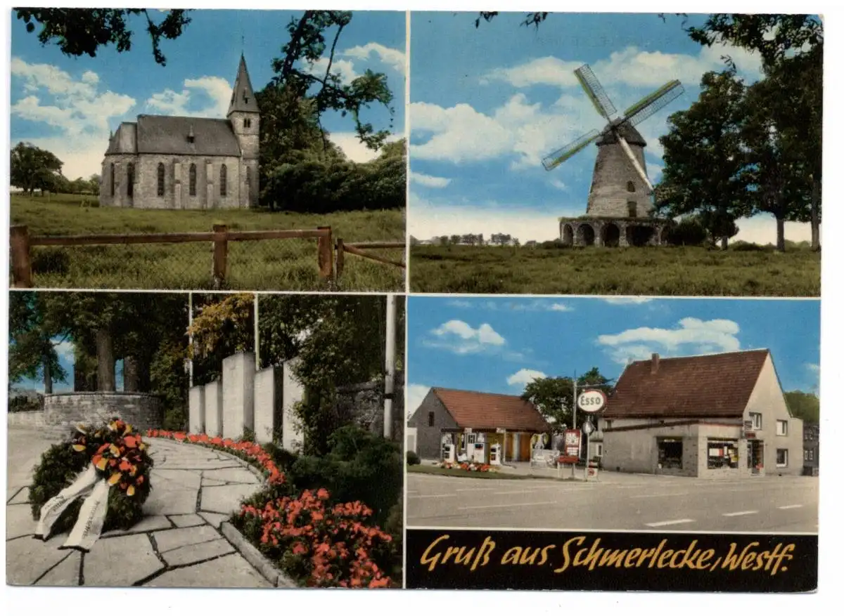 [Ansichtskarte] 4782 ERWITTE - SCHMERLECKE, Kirche, Kriegerdenkmal, Windmühle, ESSO - Tankstelle.