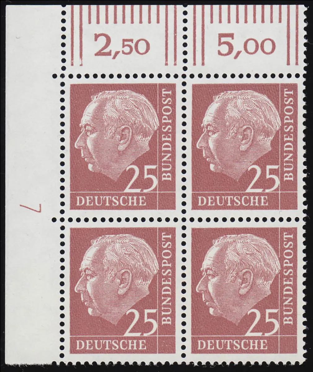 186xw Heuss 25 Pf Eck-Vierer o.l. - Druckerzeichen DZ 7 positiv, ungefaltet, **
