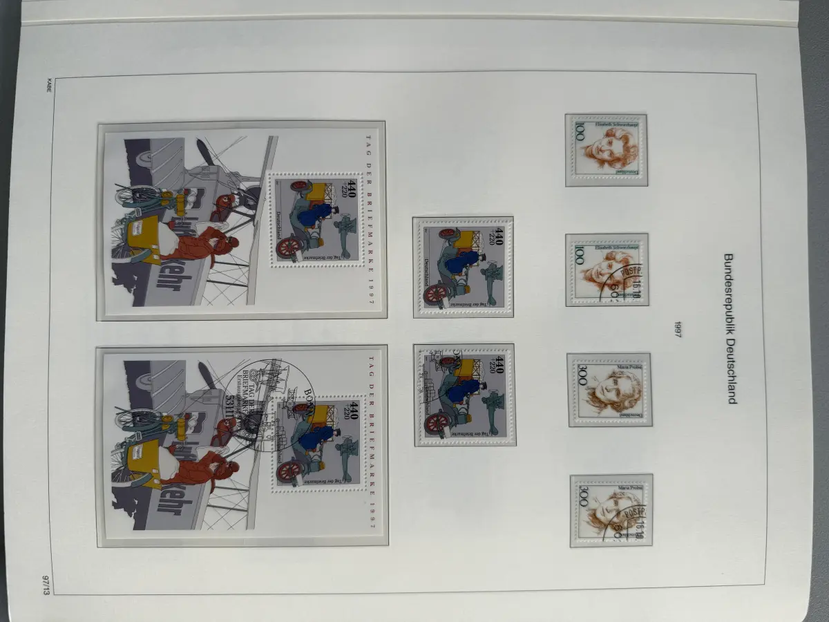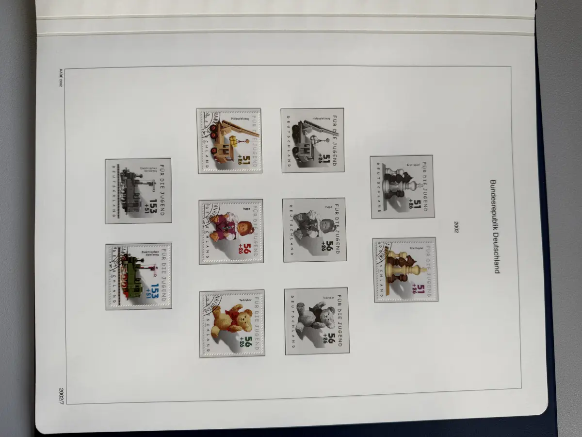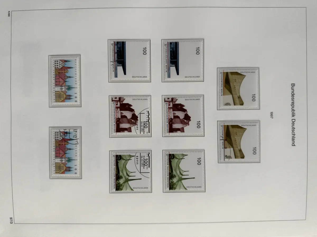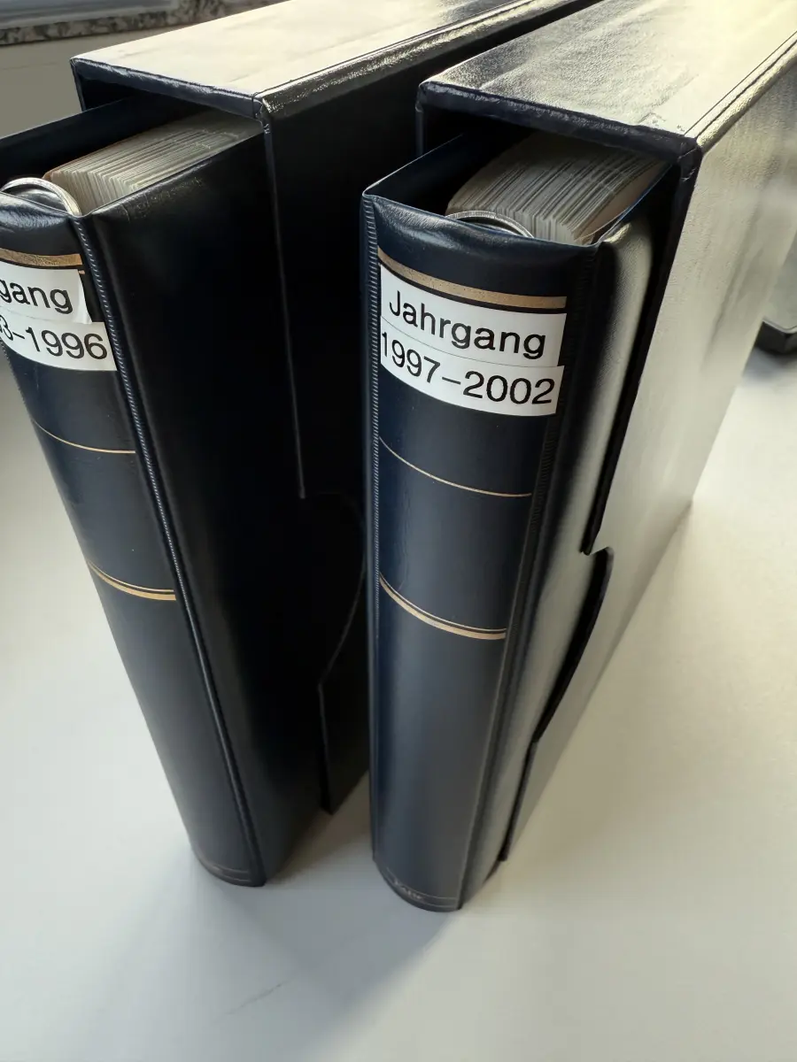 KABE Bicollect-Vordrucke mit Klemmtaschen Deutschland 1993-2002 in zwei sehr gut erhaltenen, blauen wattierten KABE-Ringbindern mit Schuber. Die Vordrucke enthalten auch noch viele postfrische Marken von 1993-2000 sowie die gestempelten Ausgaben von 1993-2002. Günstig angesetzt aus Sammler-Nachlass - der Neupreis alleine der Ringbinder war höher als der Angebotspreis.