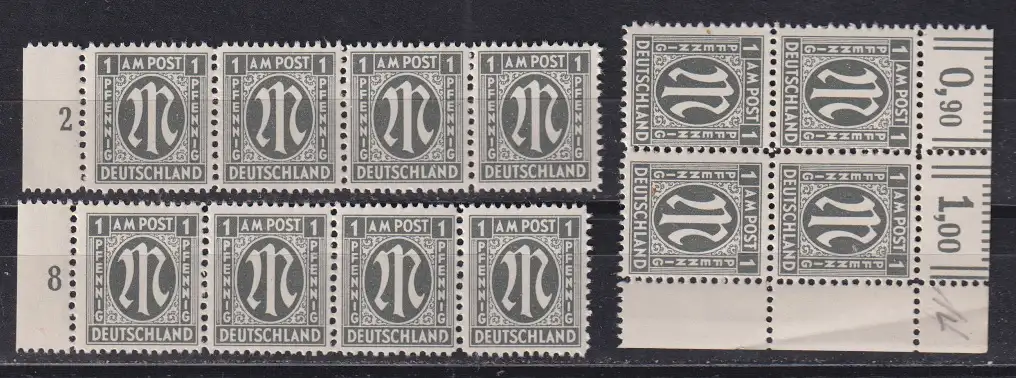 Bizone AM-Post Deutscher Druck MiNo. 16 ** Partie mit Eck-4er-Bl. oN sowie PF VI,XII