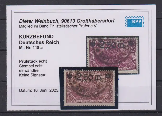 Dt.Reich 2,50M auf 2M MiNo. 118a o gpr Weinbuch BPP