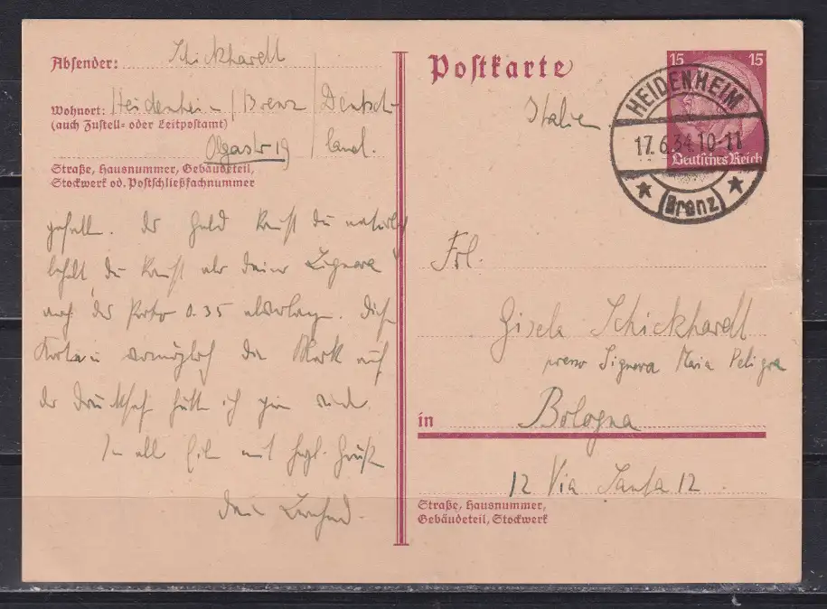 Dt.Reich Auslandskarte MiNo. P 222 Bedarf von Heidenheim(Brenz) 17.6.34 nach Italien (50.-)