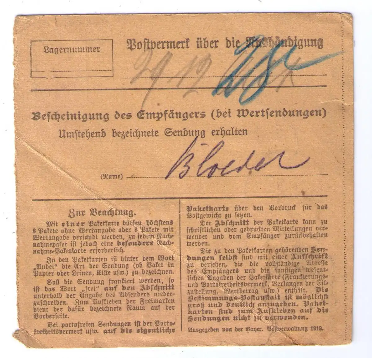 1919 - Einschreiben-Paketkarte aus München, adressiert nach Fürth