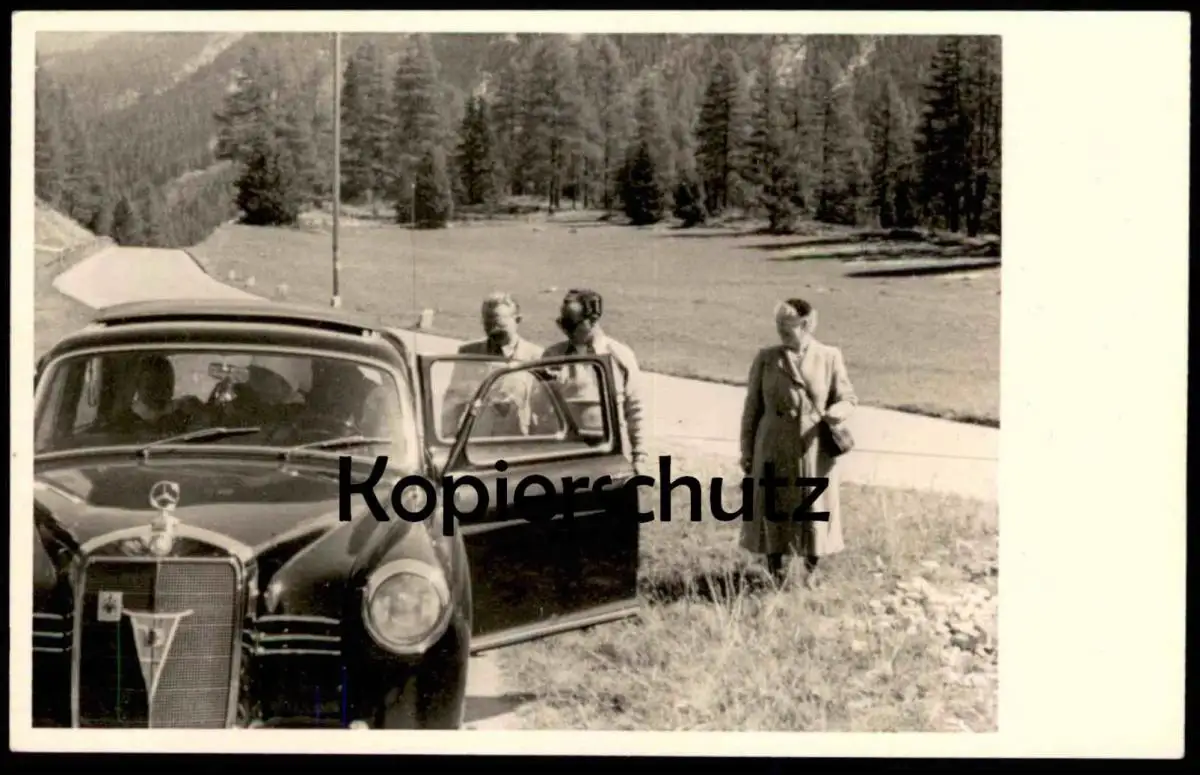 ALTE FOTO POSTKARTE RASTPLATZ AUF DEM AUTOAUSFLUG VON GRIES ÜBER SCHULS TARASP & ST. MORITZ DAIMLER BENZ MERCEDES Scuol