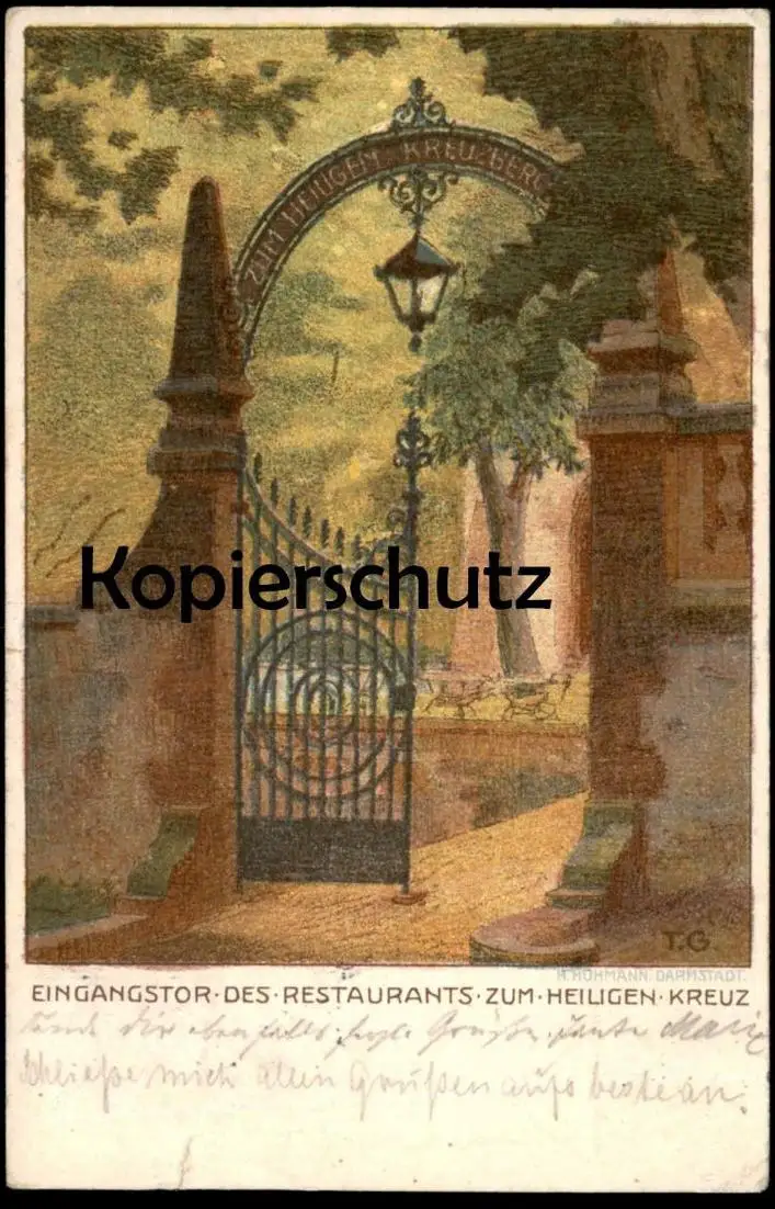 ALTE KÜNSTLER POSTKARTE DARMSTADT EINGANGSTOR DES RESTAURANTS ZUM HEILIGEN KREUZ SIGN. T. G. Verlag: Heinrich Hohmann, Darmstadt