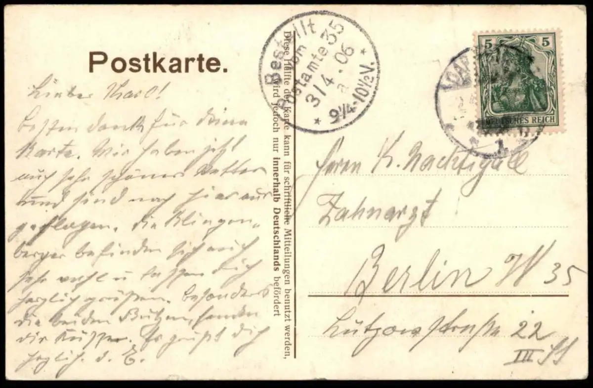 Gelaufen: 03.04.1906 mit Stempel Darmstadt nach Berlin bestellt vom Postamte 35
