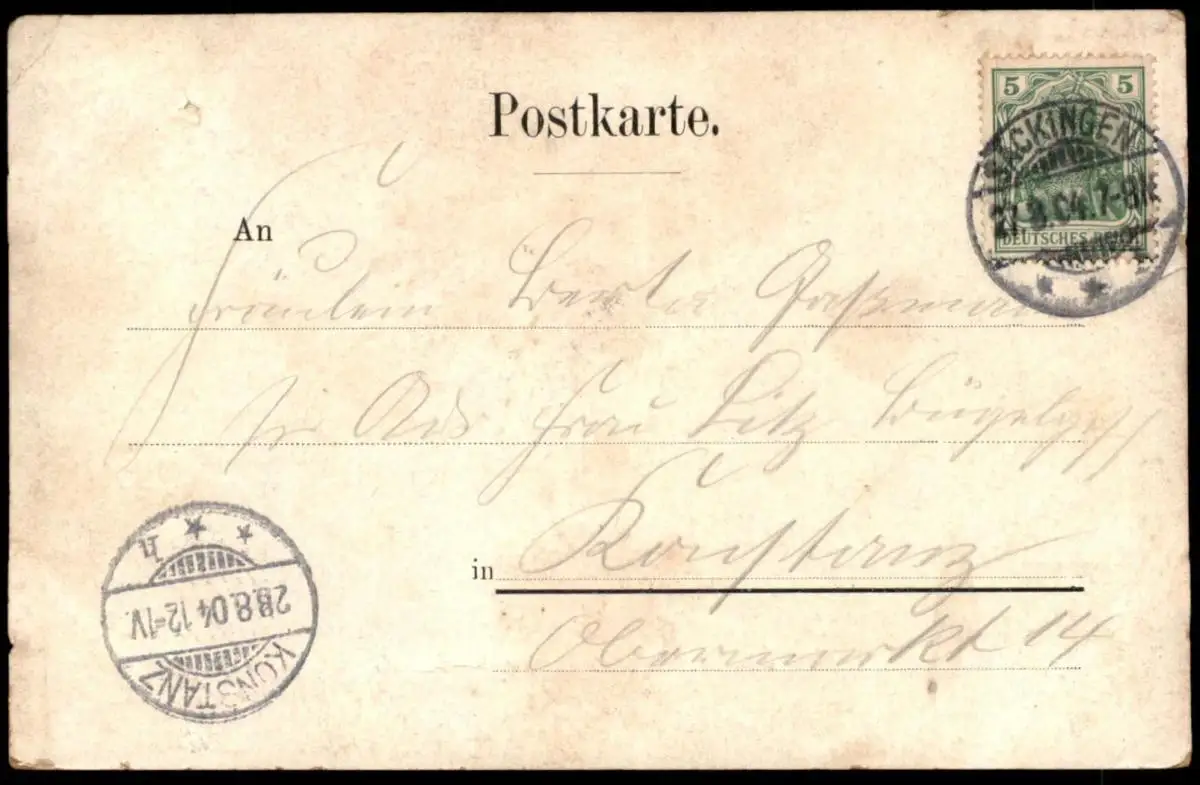 Verlag: U. Junginger´s Verlag, Stuttgart Gelaufen: 27.08.1904 mit Stempel Säckingen nach KonstanzErhaltung (s. Scan): mittel, linker & rechter Randbereich bestoßen, kleine Eindruckstelle rechts oben in Höhe Kirchturm / 916726
