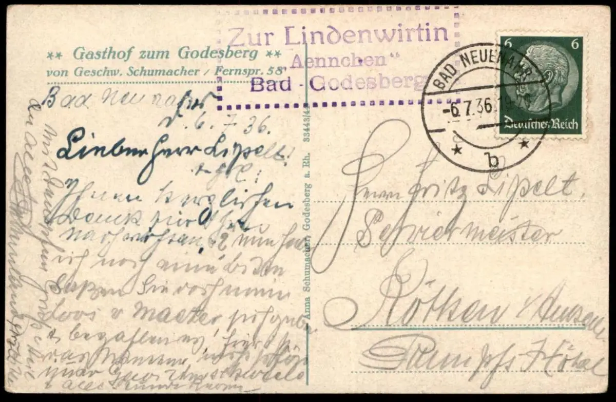 ALTE POSTKARTE ALT BONNA DU TRAUTE BONN BAD GODESBERG GASTHAUS ZUR LINDENWIRTIN AENNCHEN VON GESCHW. SCHUMACHER, rückseitig StempelVerlag: Anna Schumacher, Godesberg