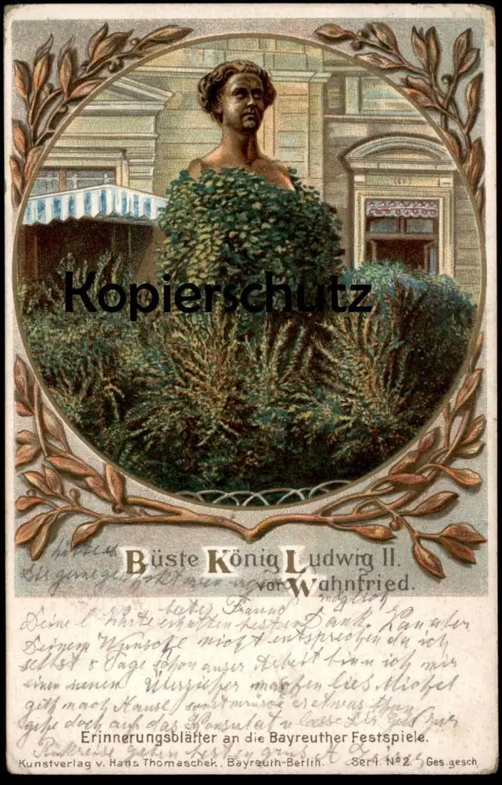 ALTE POSTKARTE BÜSTE KÖNIG LUDWIG II. VOR WAHNFRIED BAYREUTH ERINNERUNGSBLÄTTER AN DIE BAYREUTHER FESTSPIELEVerlag: Hans Thomaschek, Bayreuth-Berlin