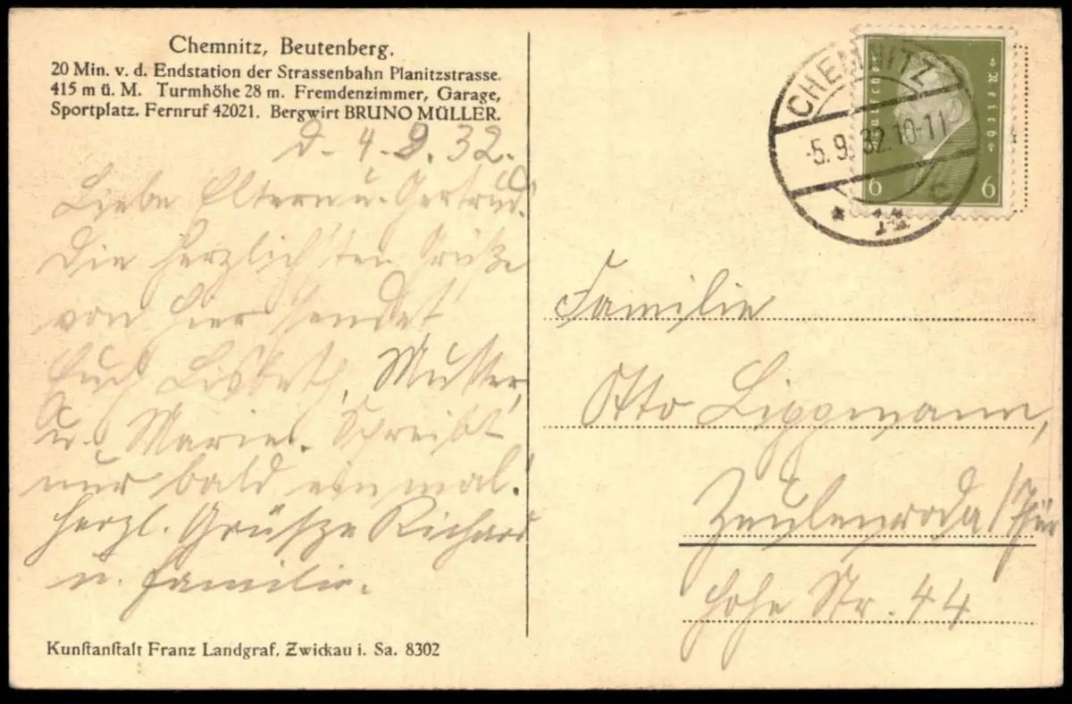 ALTE POSTKARTE CHEMNITZ UNTERKUNFTSHAUS BEUTENBERG 20 MINUTEN VON DER ENDSTATION DER STRASSENBAHN PLANITZSTRASSEVerlag: Franz Landgraf, Zwickau