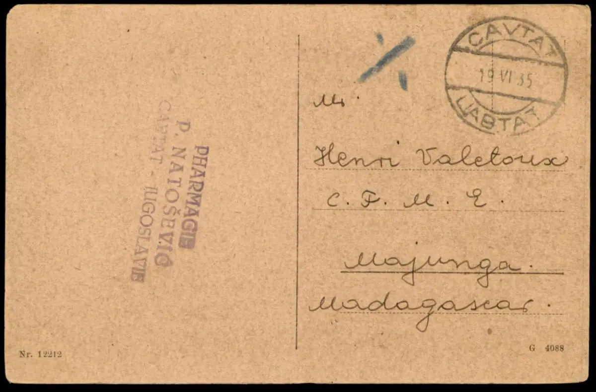 Gelaufen: 19.06.1935 nach Madagascar mit Briefmarke King Alexander überdruckt mit Jugoslavija, Stempel Cavtat LabtatErhaltung (s. Scan): gut, Ecken leicht bestoßen / 916416