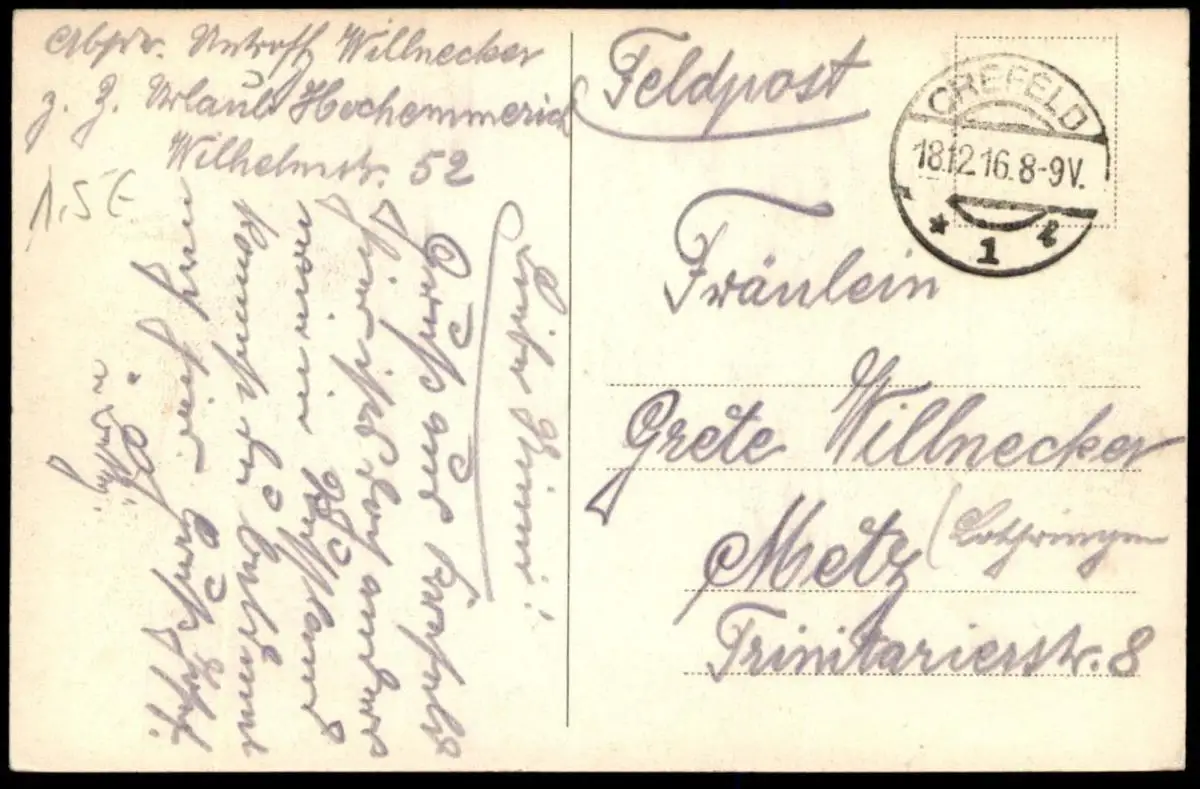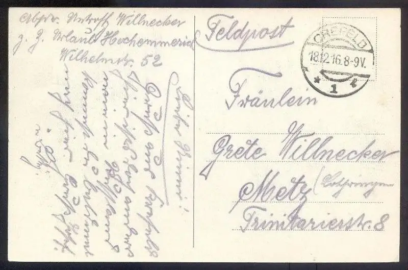 Gelaufen: 18.12.1916 als Feldpost mit Stempel Crefeld nach Metz
