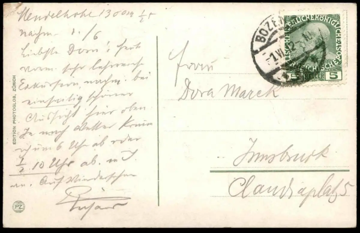 Gelaufen: 01.06.1912 mit Stempel Bozen nach Innsbruck, beschriftet mit Mendelhöhe