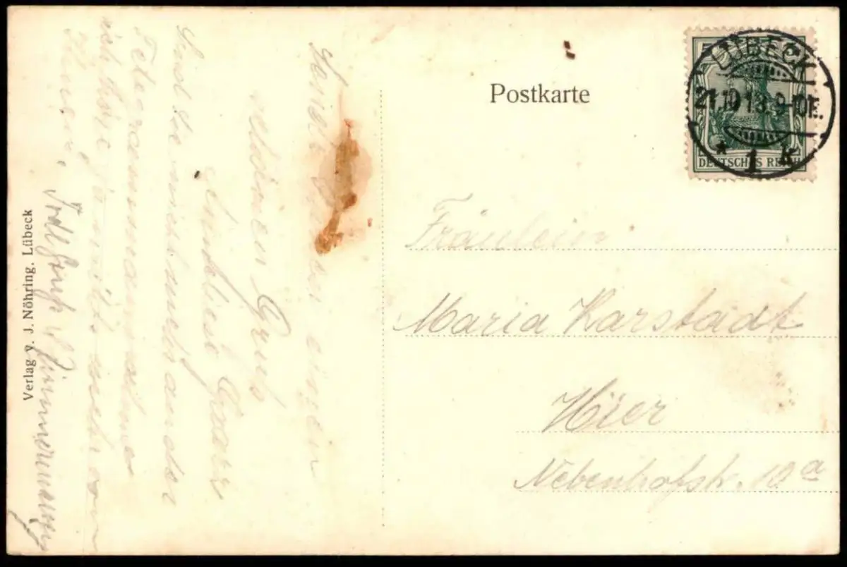 Gelaufen: 21.10.1913 mit Stempel Lübeck nach Lübeck
