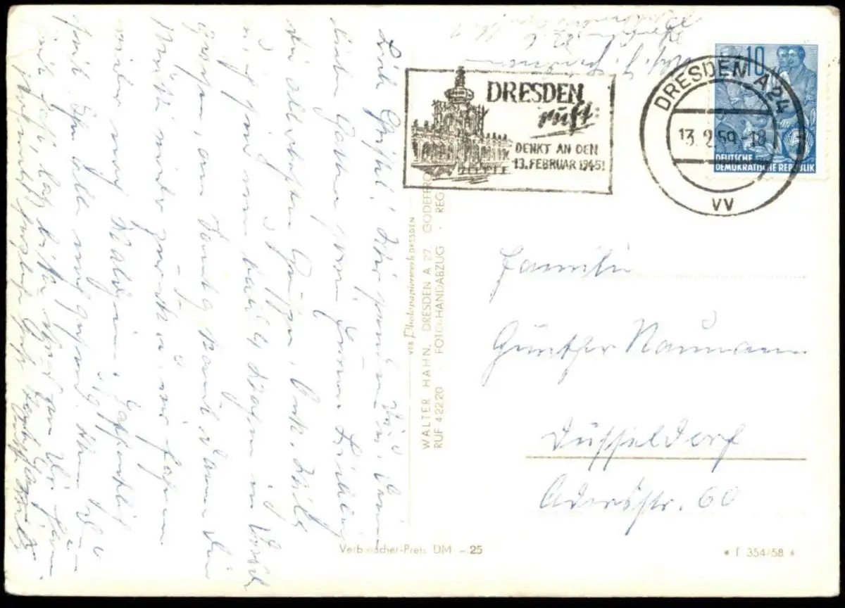 Gelaufen: 13.02.1959 mit Stempel Dresden ruft: Denkt an den 13. Februar 1945 FrauenkircheErhaltung (s. Scan): gut - mittel, Ecken leicht bestoßen / 915268