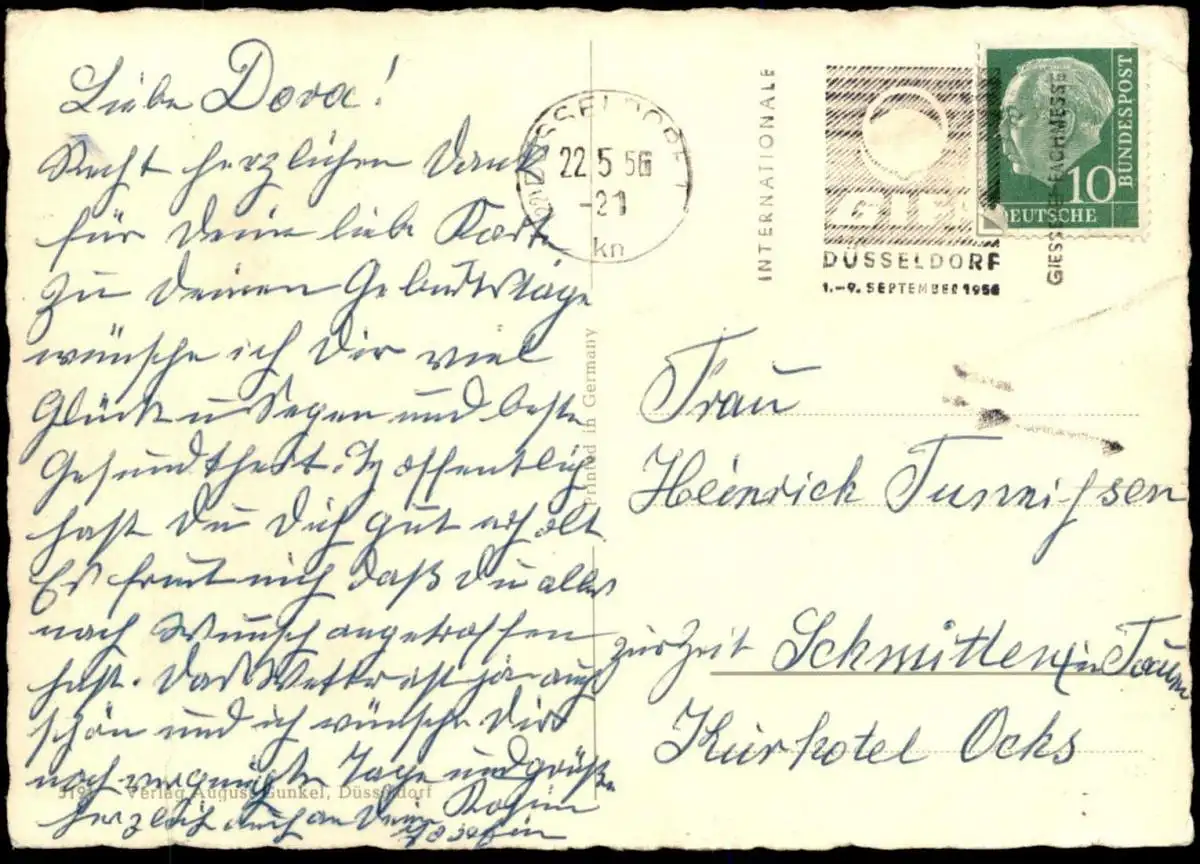 Gelaufen: 22.05.1956 mit Stempel Düsseldorf nach Schmitten Taunus