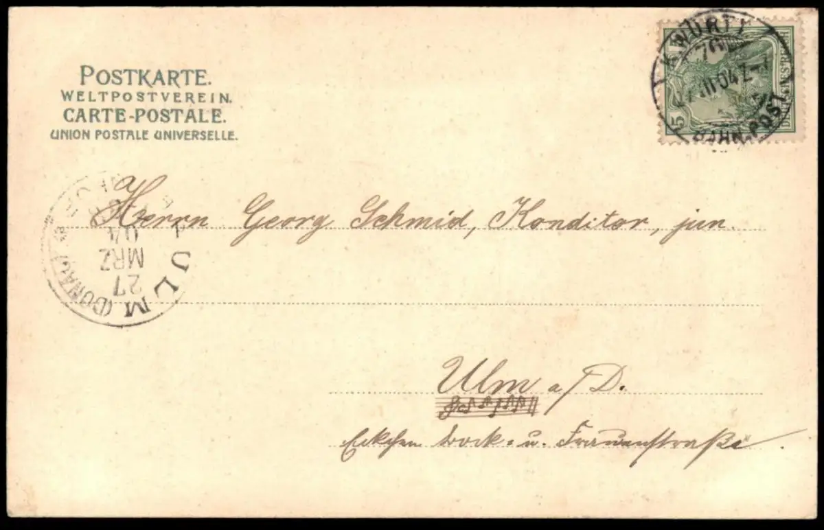 Gelaufen: 27.03.1904 mit Stempel Königlich Württembergische Bahnpost nach Ulm Konditor Georg Schmid jun.Erhaltung (s. Scan): gut / 917039