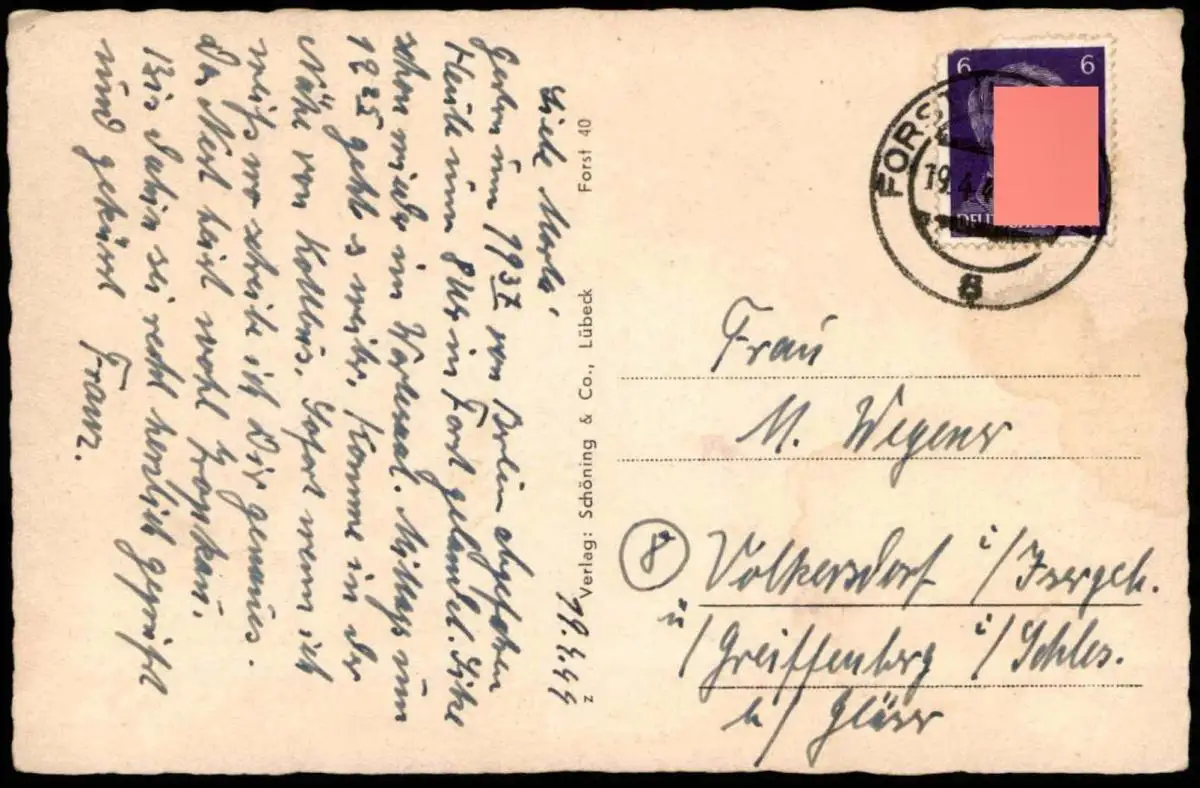 Gelaufen: 19.04.1944 mit Stempel Forst Lausitz nach Volkersdorf im Isergebirge über Greiffenberg in Schlesien