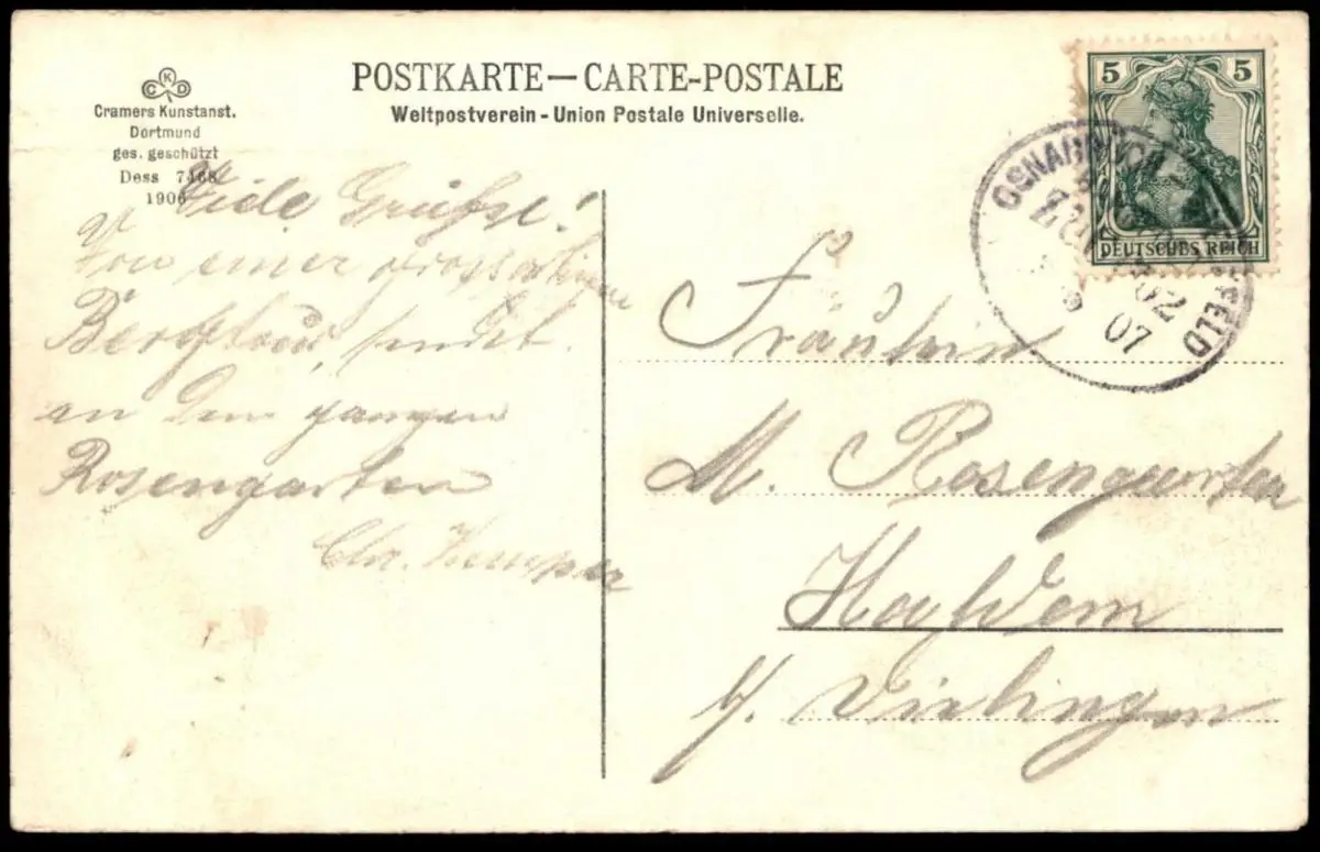 Gelaufen: xx.06.1907 mit Bahnpoststempel Zug 802 Osnabrück - Bielefeld nach Haldem Post Dielingen