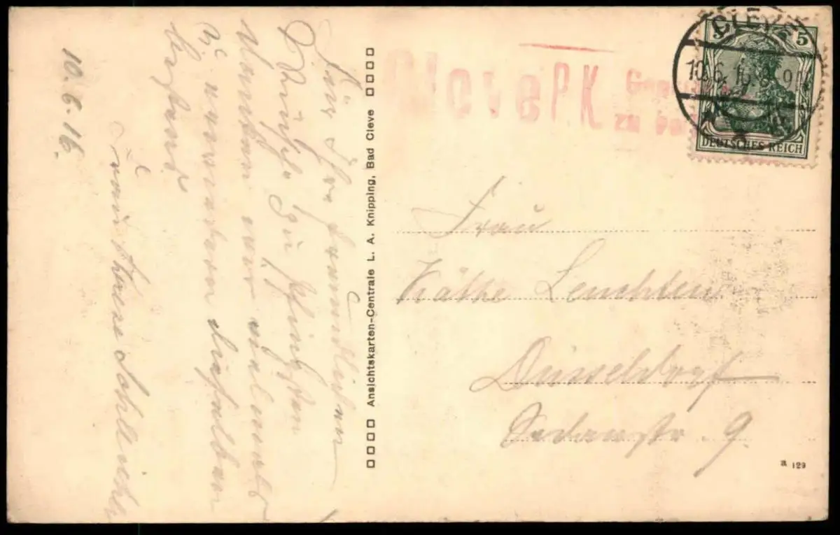 Gelaufen: 10.06.1916 mit Stempel Cleve sowie rotem Stempel Cleve P.K. nach Düsseldorf