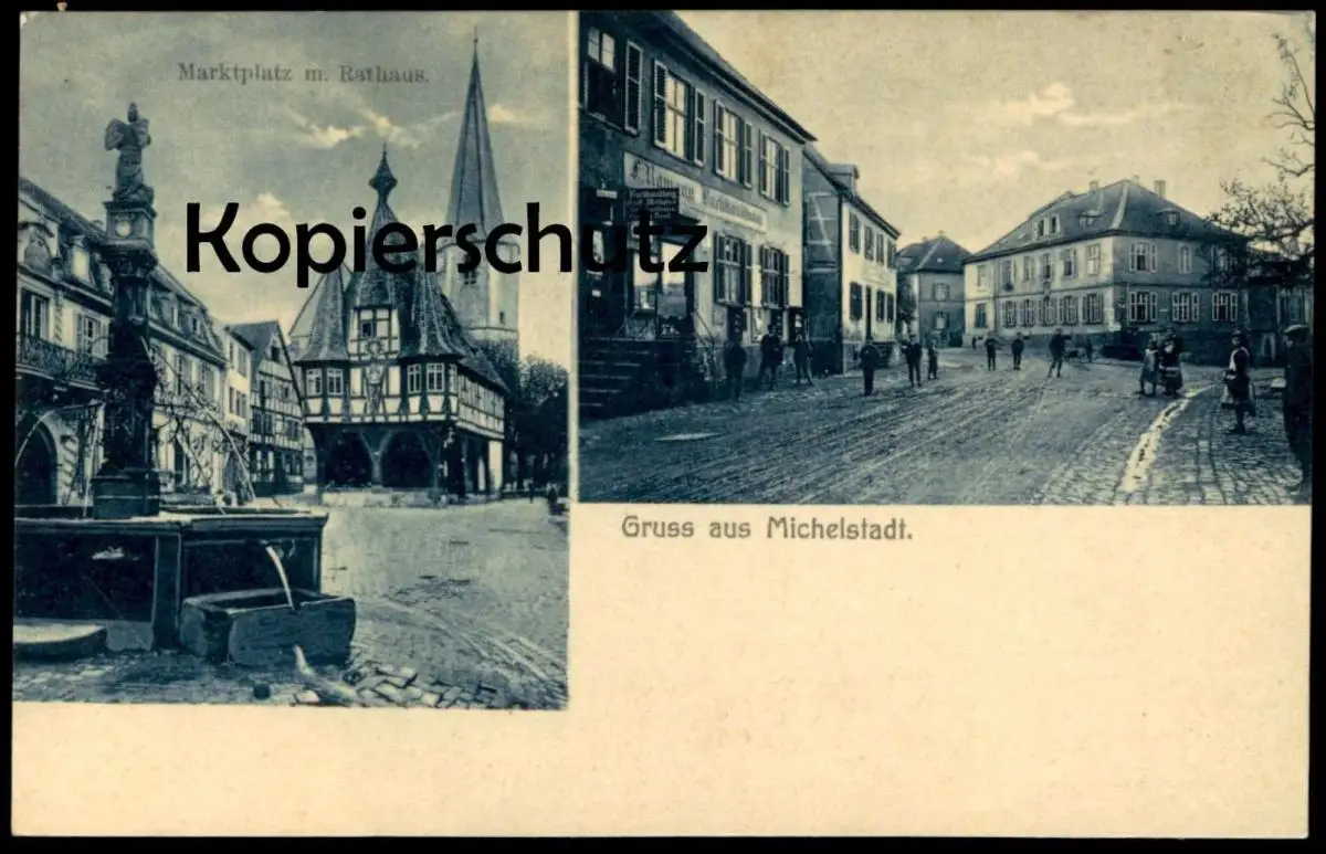 ALTE POSTKARTE GRUSS AUS MICHELSTADT MARKTPLATZ MIT RATHAUS BUCHHANDLUNG F. RAMANN MUSIKALIEN HEINRICH KRAFTVerlag: Jos. Kolmer, Erbach