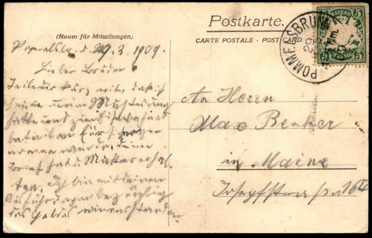 Gelaufen: 29.03.1909 mit Stempel Pommelsbrunn nach Mainz