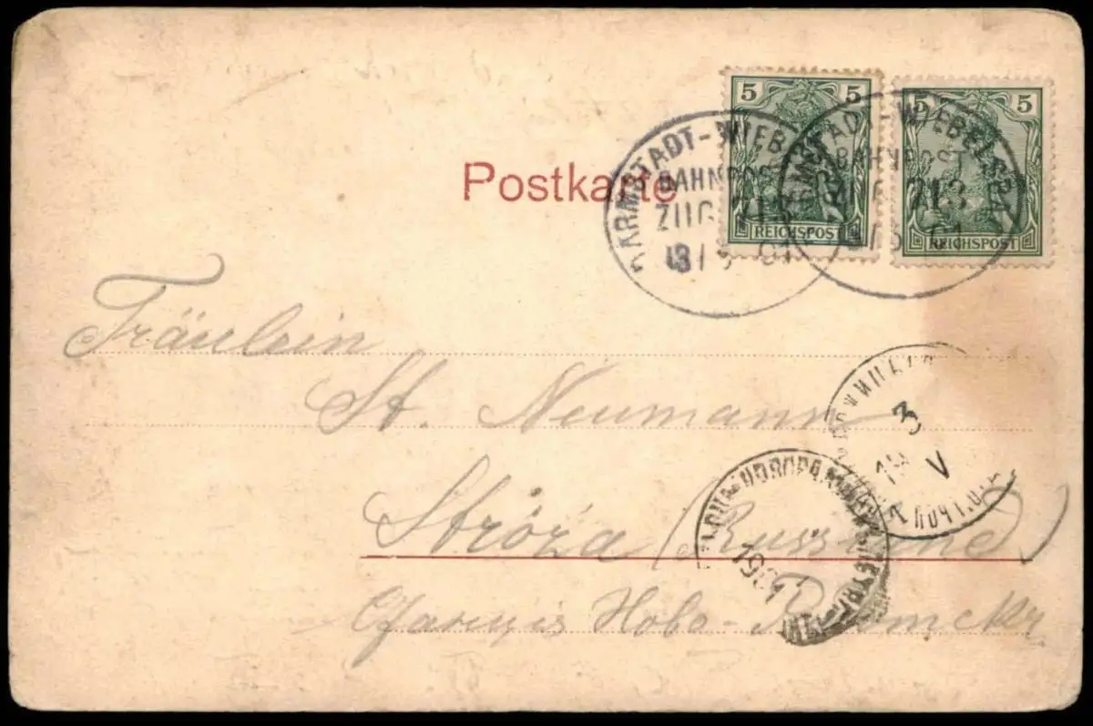 Gelaufen: 13.05.1901 mit Bahnpost-Stempel Darmstadt Wiebelsbach Zur 713 nach Stroza Russland