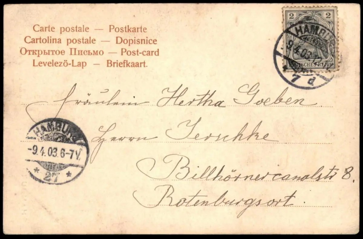 Gelaufen: 09.04.1903 mit Stempel Hamburg nach Hamburg Rotenburgsort